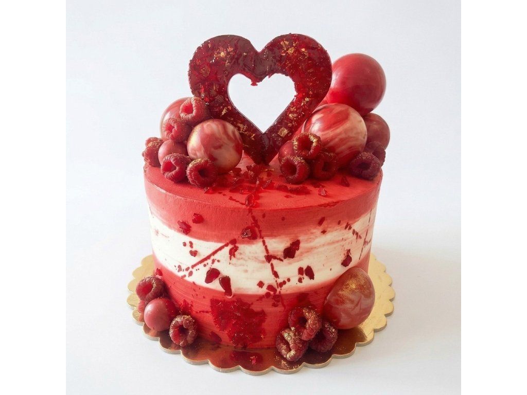 Ozdoba – karamelové srdce, čokoládová koule, ovoce.