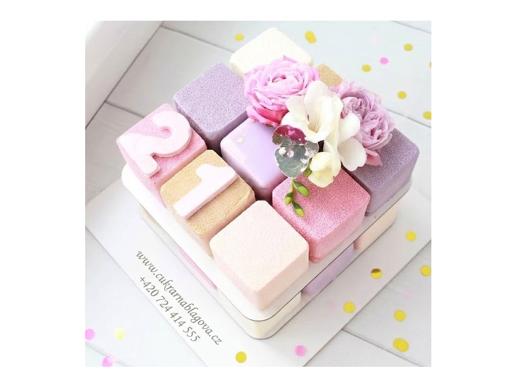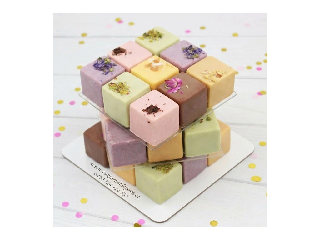 Designový mousse dort ve tvaru Rubikovy kostky je exkluzivní dort na zakázku pro 15–25 osob. Moderní cukrářské zpracování, precizní vzhled a kombinace šesti různých příchutí z něj dělají ideální volbu pro náročné zákazníky.