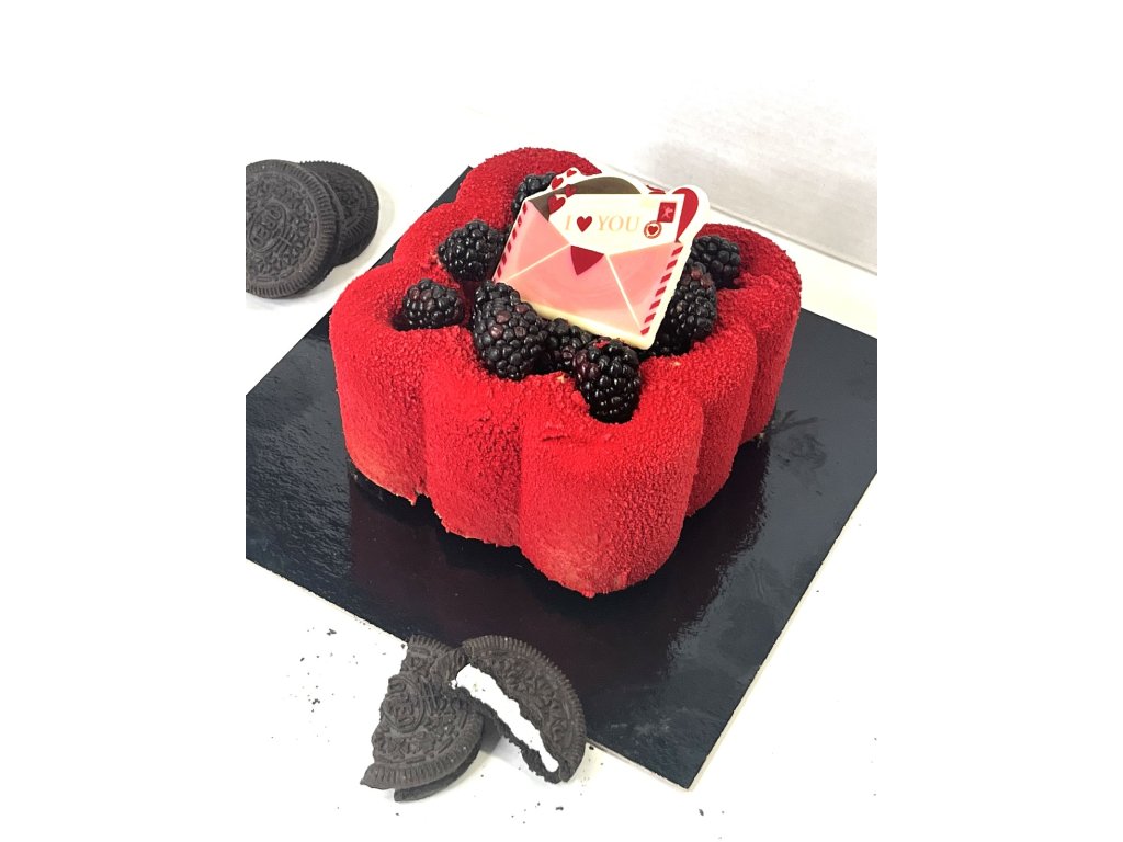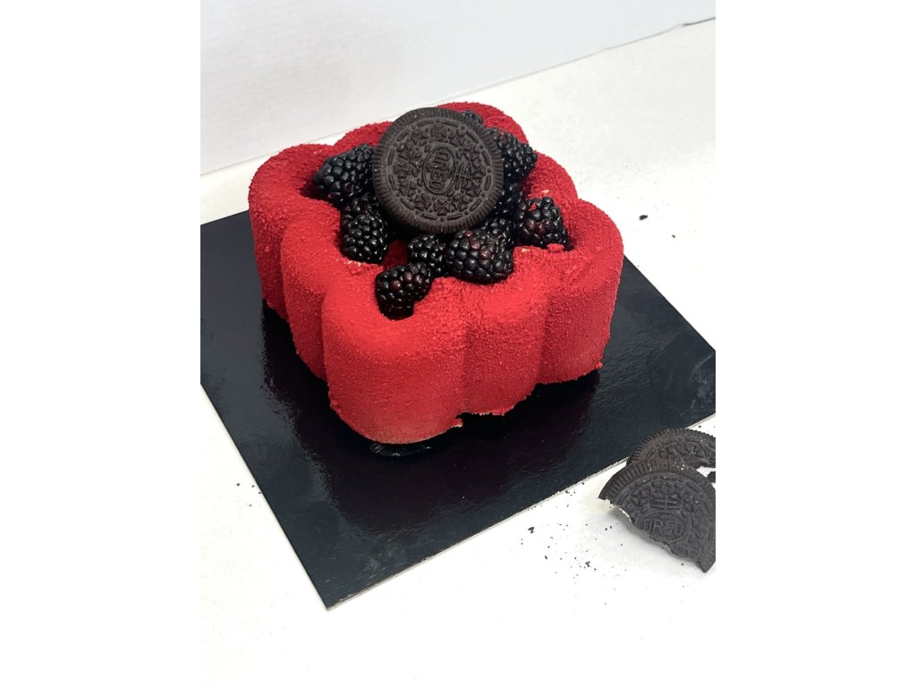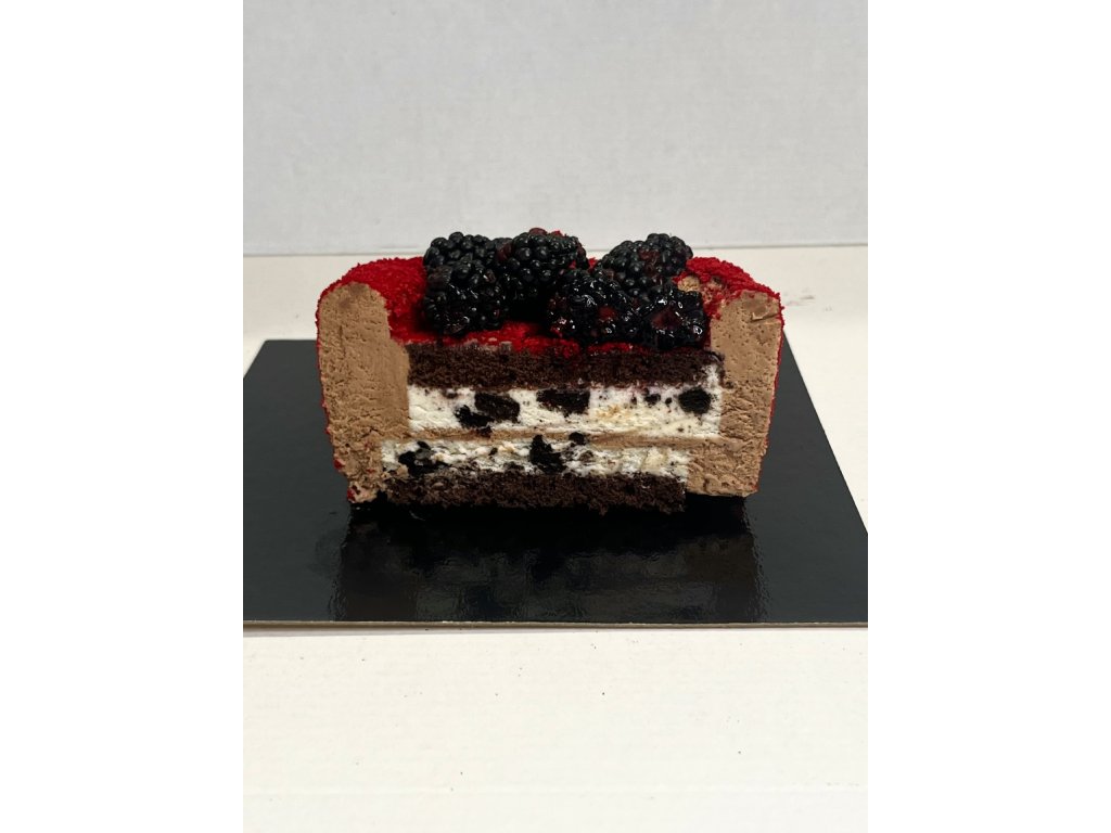 Nadýchaný čokoládový piškot, krémová Oreo pěna , čokoládová pěna. Sametový povrch z bílé čokolády.