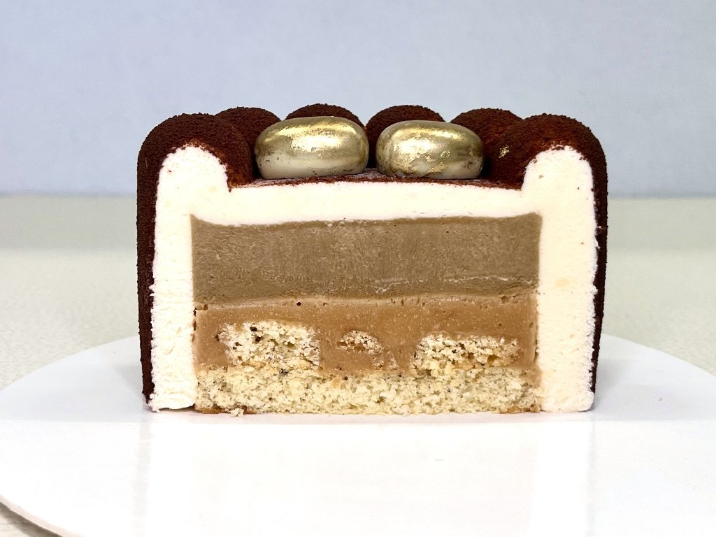 Piškotový korpus s lískovými oříšky, lískové sušenky, karamel, kávový krém a lískovo-oříšková pěna.