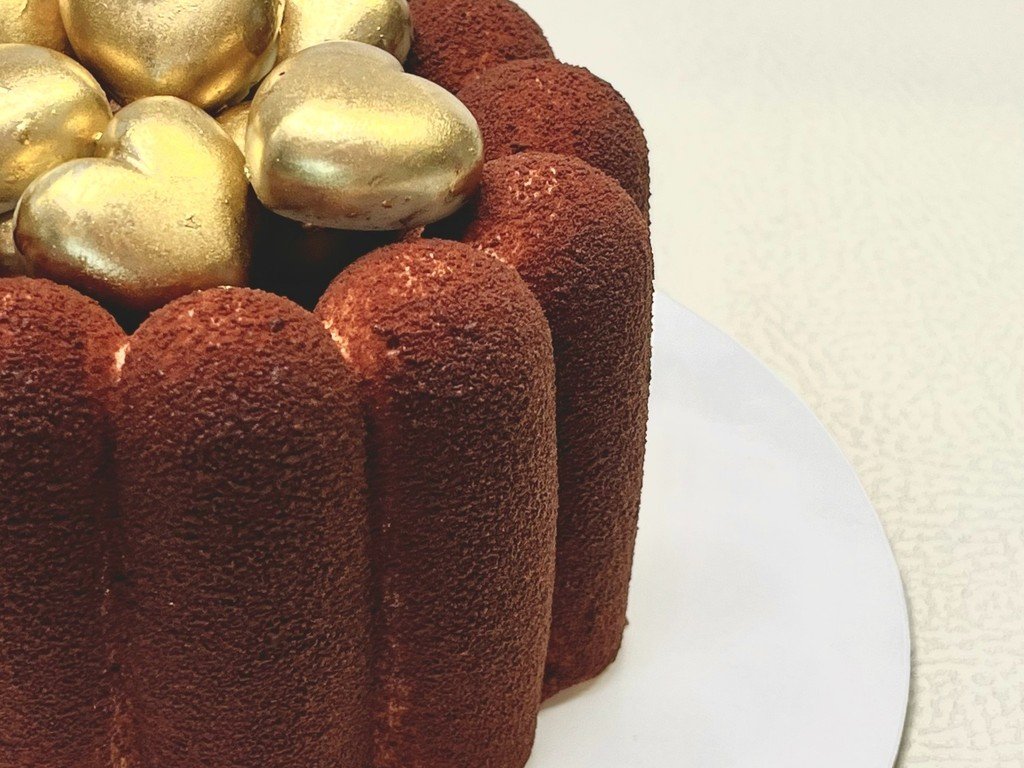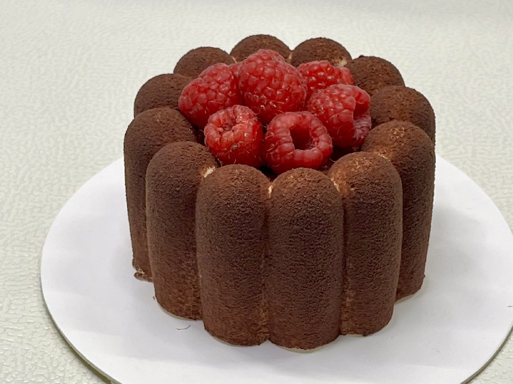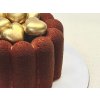 To vše je potaženo sametovým povrchem na bázi hořké belgické čokolády. Ozdoba čokoládová srdíčka nebo maliny.