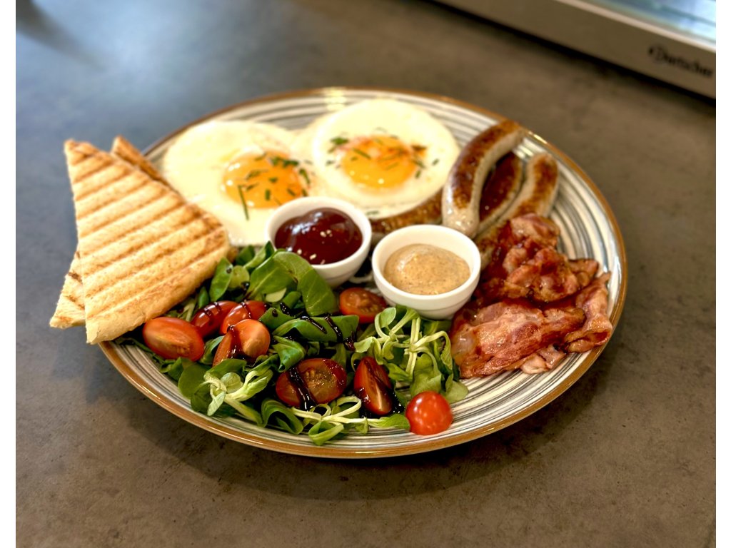 Smažené vejce se slaninou, mini klobáskami a salátem